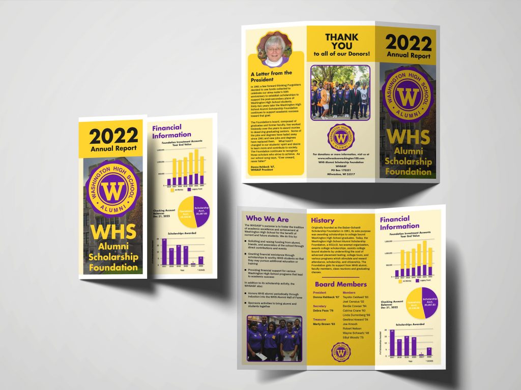 This project started as a class project, where all students had to create a brochure for WHSASF’s annual report. We were told at the beginning of the project that whichever student’s design was the favorite of WHSASF would be used for their real annual report at the end of the project. I saw this as an opportunity to include a real client piece in my portfolio, and with a little bit of planning, I got chosen!